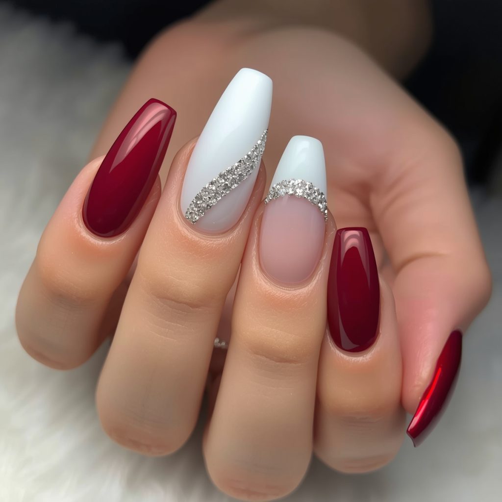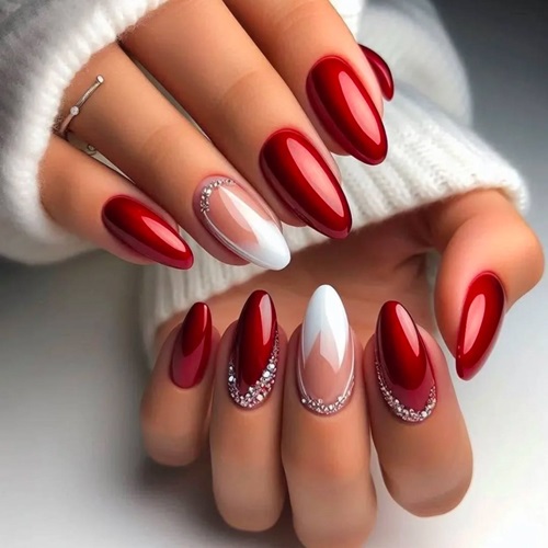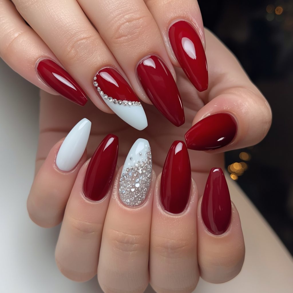A sultry, festive masterpiece, “Crimson Winter Kiss” captures the magic of holiday nights. Deep, glossy cherry-red gel coats most nails in a rich, vampy shine that radiates warmth against winter’s chill. Two accent nails steal the show: one pure snow-white almond tip with a delicate diagonal sweep, the other a barely-there nude base kissed by a fine crescent of silver micro-glitter and tiny crystal placements that sparkle like fresh snowfall under streetlights.