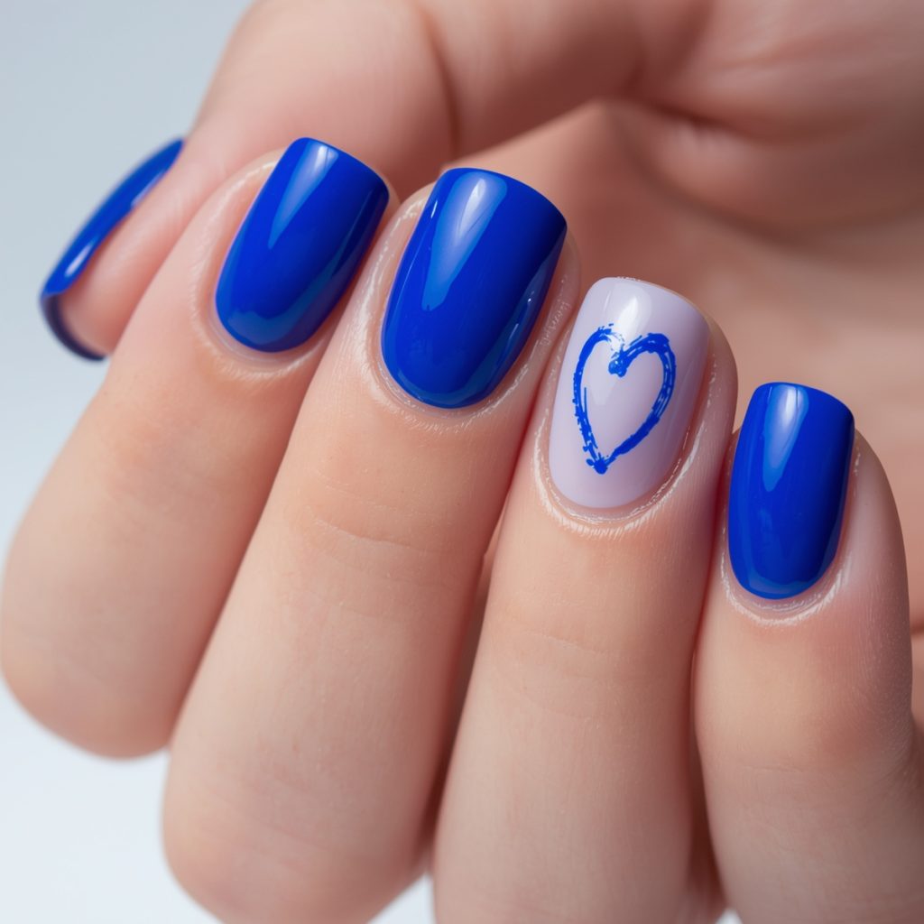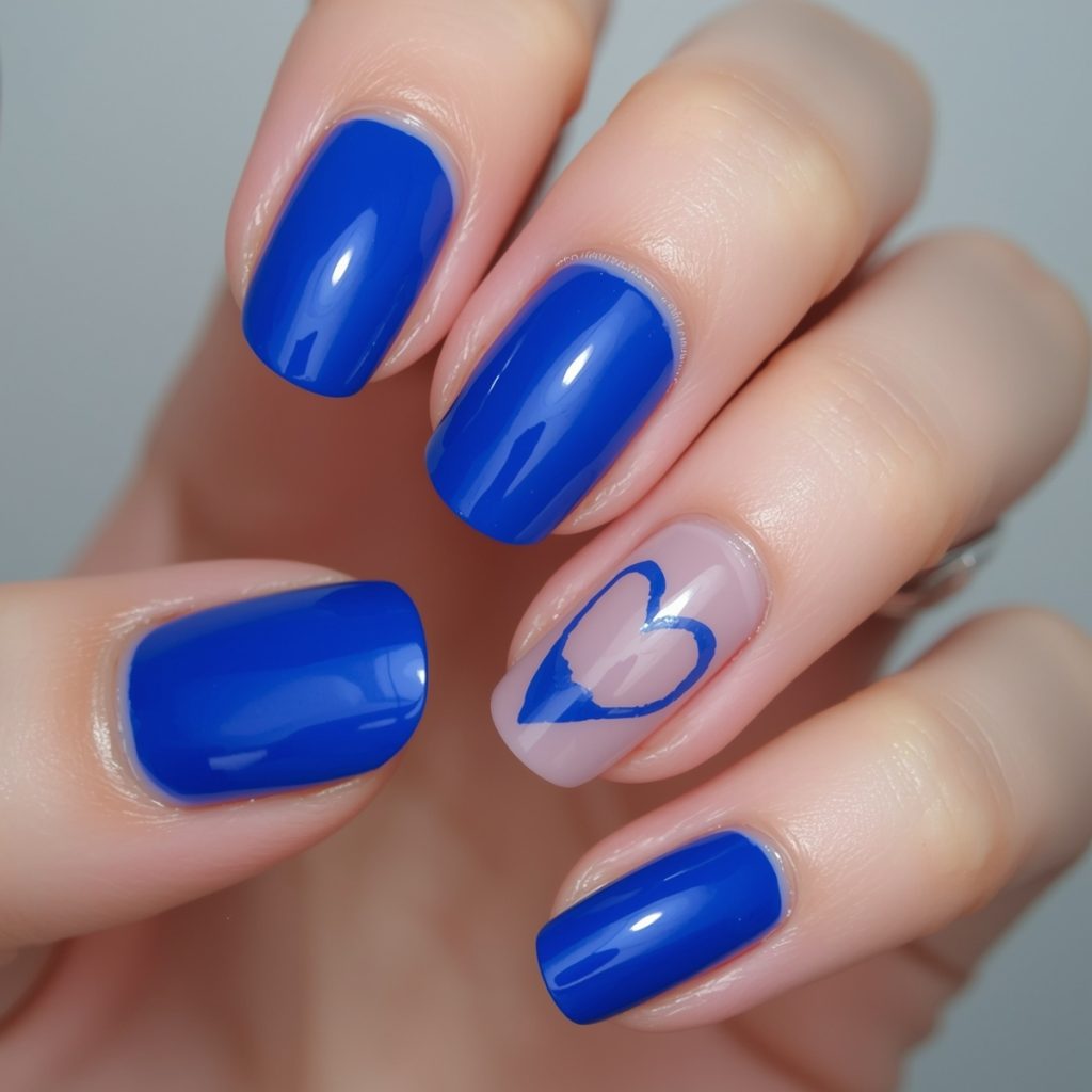 This bold and vibrant manicure, named “Electric Blue Love,” combines a striking cobalt blue with a soft nude accent to create a modern romantic statement. The rich, glossy electric blue coats most nails, delivering high-impact color that feels confident and contemporary. Two accent nails feature a sheer nude base with a hand-painted sapphire heart outline, adding a sweet yet minimalist touch of love and playfulness.