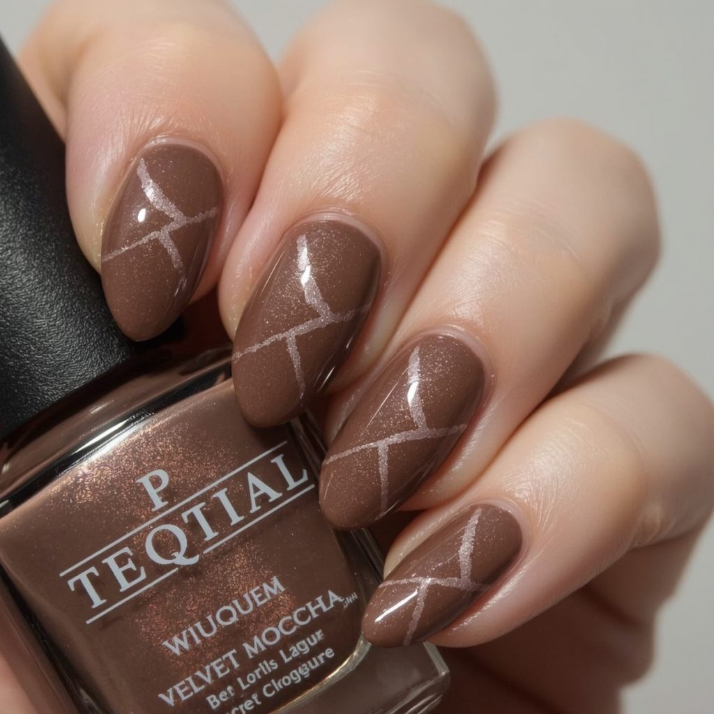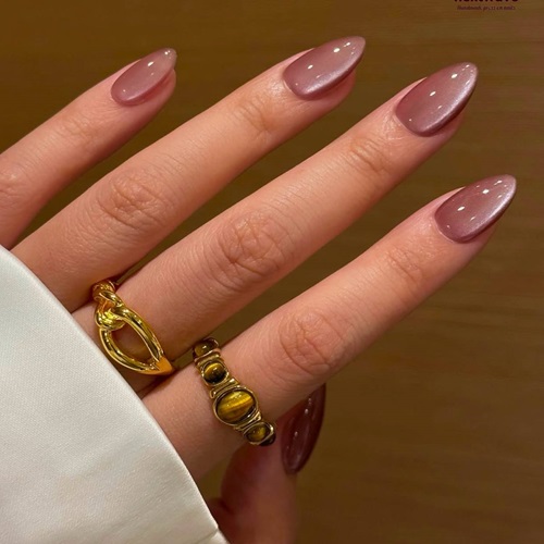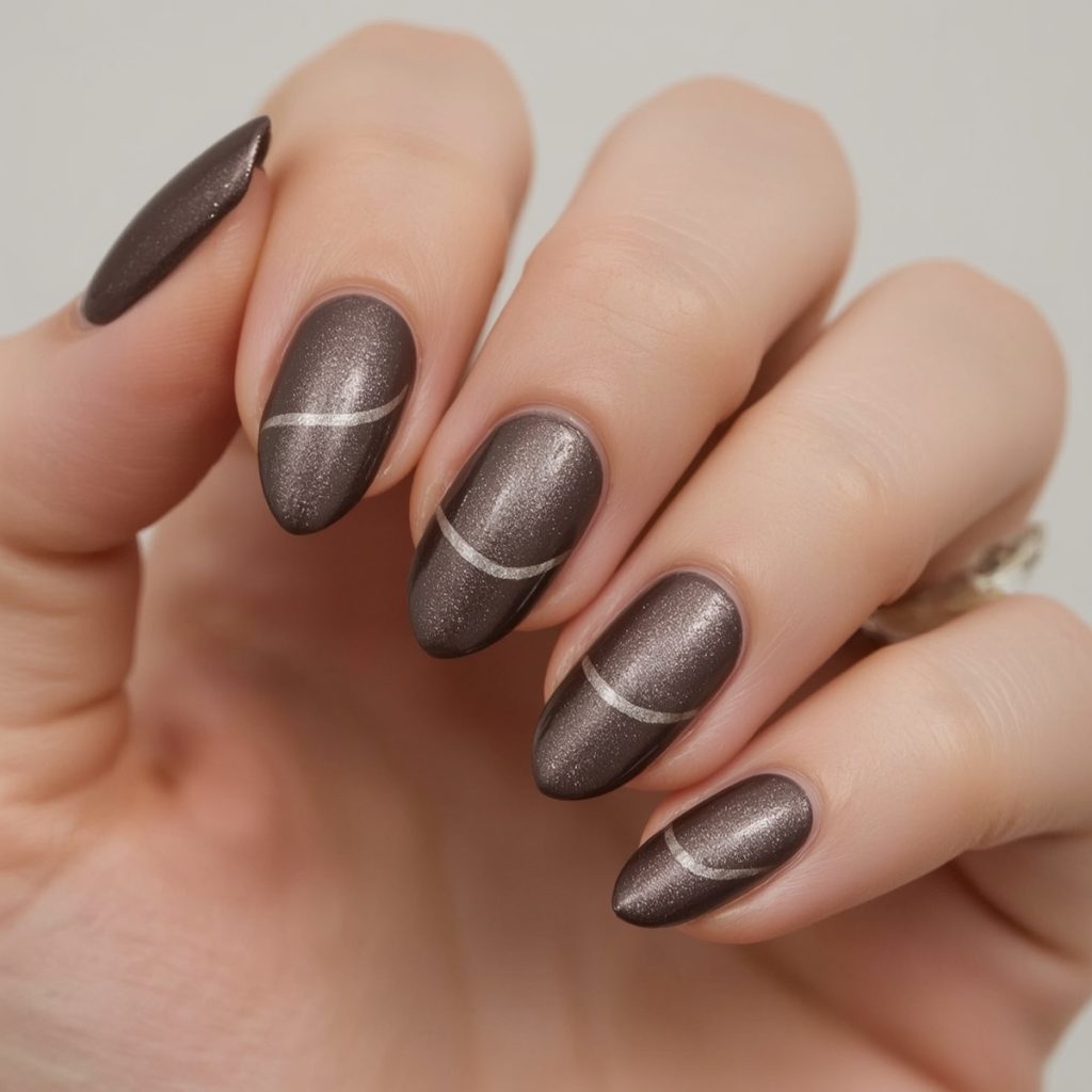 Sophisticated and hypnotic, “Velvet Mocha Cat Eye” is quiet luxury in manicure form. A silky, muted mauve-taupe base catches the light with a delicate, shimmering cat-eye ribbon that dances across each almond-shaped nail like liquid satin. The magnetic effect creates a subtle yet mesmerizing depth (never loud, always refined), shifting from warm cocoa to cool rose depending on the angle.