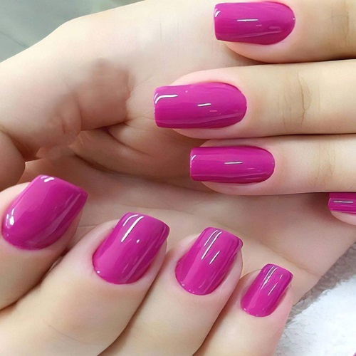 This electrifying manicure, “Magenta Rush,” is pure unapologetic glamour. A vivid, high-gloss magenta-pink floods every nail with bold, head-turning energy that screams confidence and joy. The shade sits perfectly between hot pink and fuchsia, delivering maximum impact while remaining undeniably chic. Its mirror-like shine catches light from every angle, creating a luxurious, almost liquid-metal effect that looks expensive and salon-fresh.