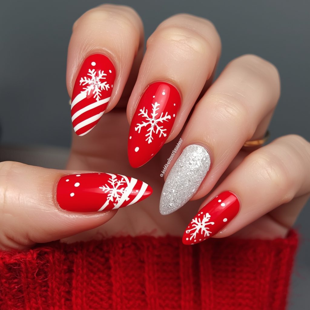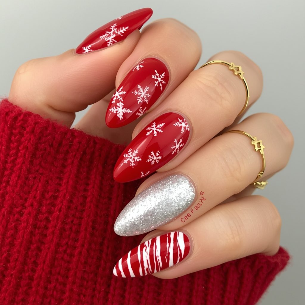 The accent nail shimmered in icy silver-white glitter acts as a frosty highlight, mimicking fresh fallen snow under moonlight. Almond-shaped tips keep the look modern and elongated, making fingers appear graceful. Paired with cozy red knits and delicate gold rings, this manicure is both festive and chic—ideal for holiday parties, Christmas morning photos, or simply spreading seasonal joy. It’s a perfect blend of tradition and trend that screams winter wonderland luxury!