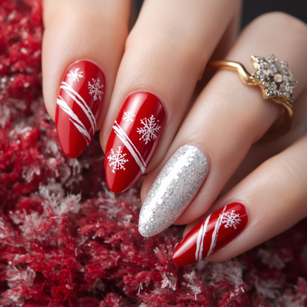 his stunning Christmas nail design perfectly captures the magic of winter holidays with a playful yet elegant twist. The bold glossy red base evokes classic candy canes and festive cheer, while crisp white diagonal stripes on select nails add that signature peppermint swirl effect. Delicate hand-painted snowflakes in pure white dance across the red canvas, bringing a touch of snowy sparkle and sophistication.