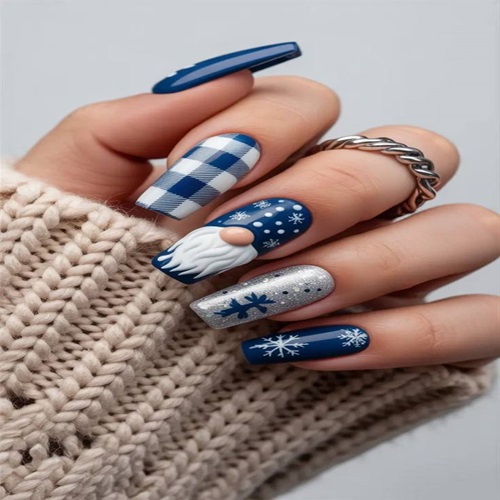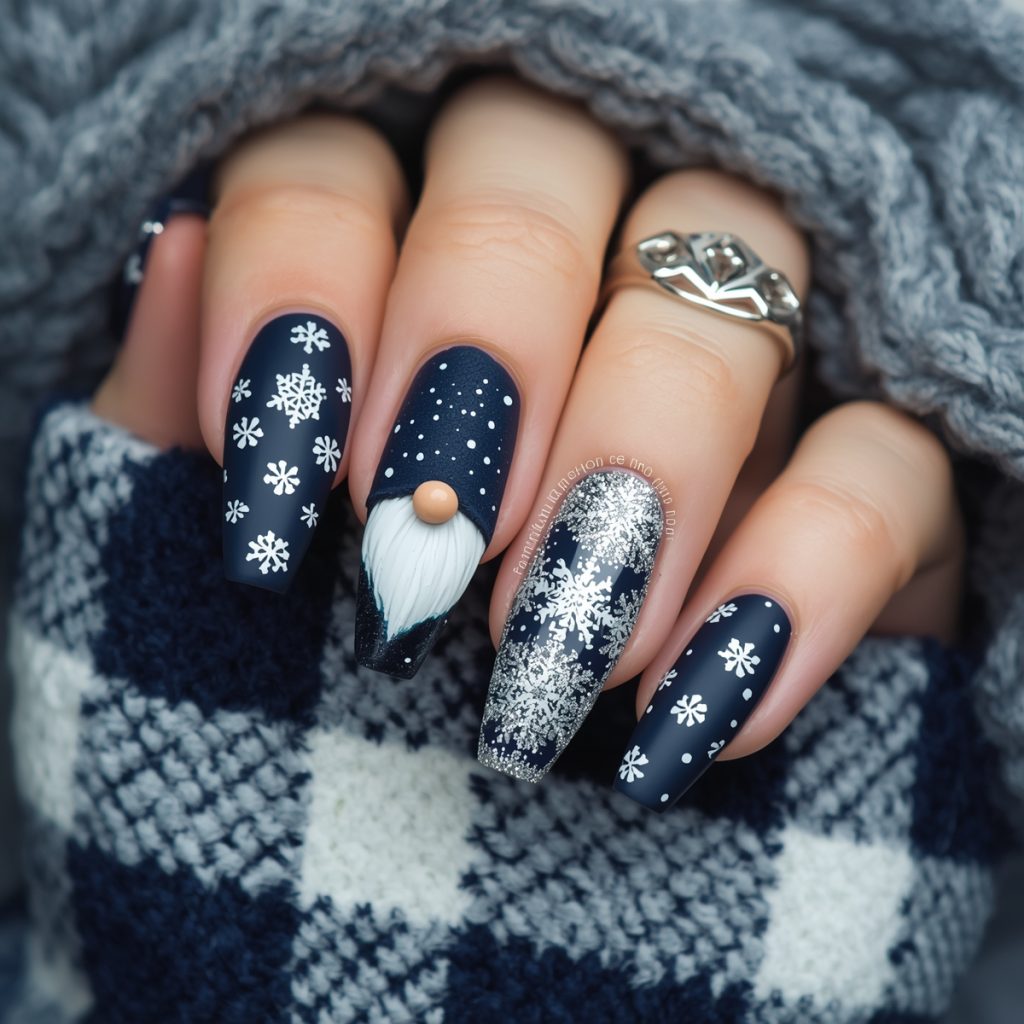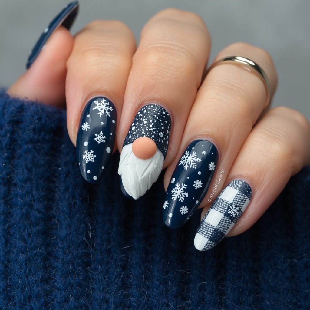 This cozy-chic winter set wraps your nails in a Scandinavian Christmas dream. Deep midnight navy serves as the perfect snowy-night canvas, paired with crisp white-and-navy buffalo plaid that instantly evokes warm flannel blankets. The star of the show is an adorable 3D gnome on the ring nail: fluffy white beard, rosy nose peeking from under a tall navy hat dusted with tiny snowflakes, looking like he just stepped out of a Nordic forest.