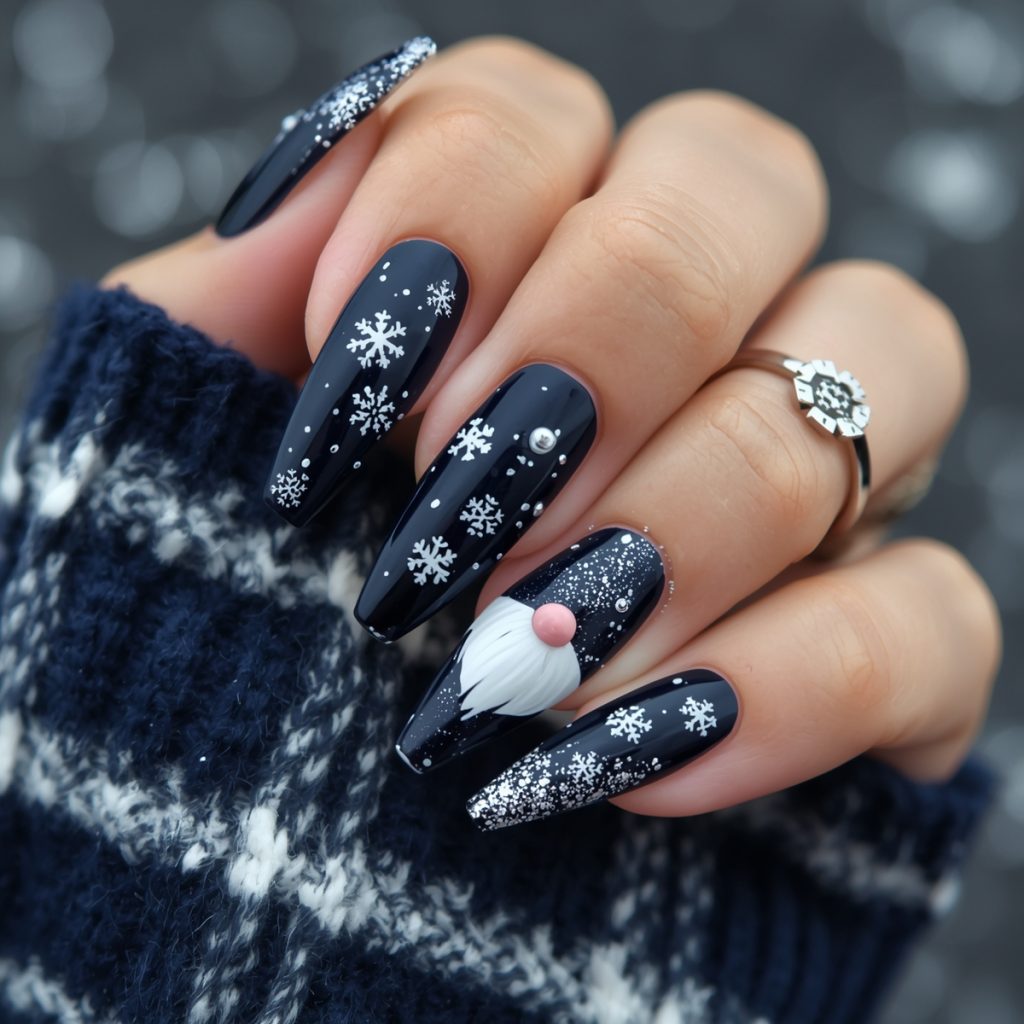 Supporting nails sparkle with silver micro-glitter and hand-painted white snowflakes in varying sizes, while delicate chrome snowflake decals float like falling flakes. The long coffin shape adds modern drama, balanced beautifully by the playful folk vibe. Paired with chunky knits and silver rings, “Midnight Gnome” is equal parts whimsical and sophisticated: perfect for anyone who wants their manicure to feel like a hug from a holiday gnome himself.
