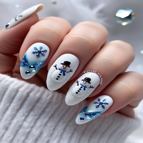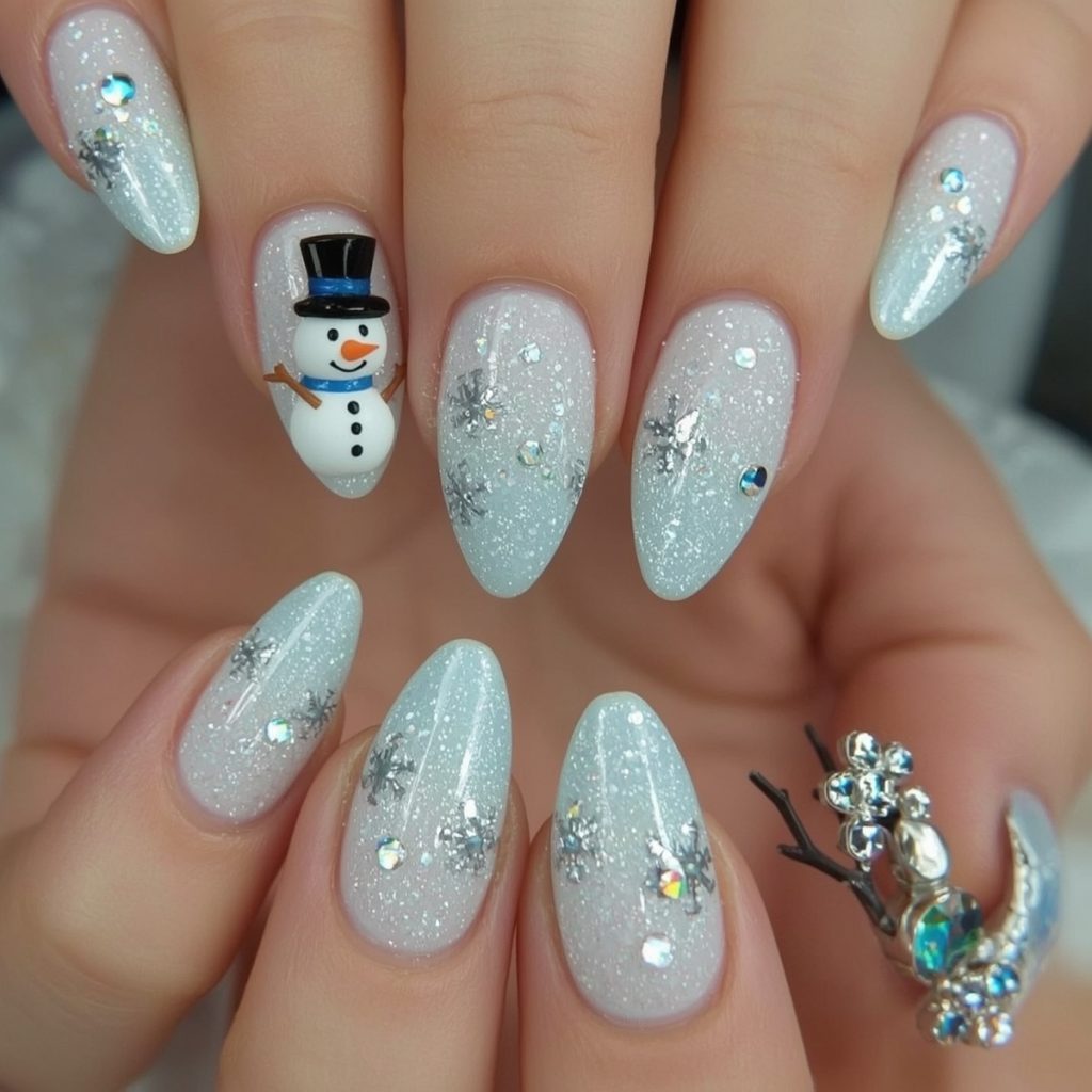 This enchanting winter manicure brings everyone’s favorite snowman to life with adorable 3D charm. Two nails steal the show with meticulously sculpted miniature snowmen: crisp white bodies, tiny black coal eyes and buttons, carrot-orange noses, blue scarves, and jaunty top hats, all popping against a velvety matte white base.