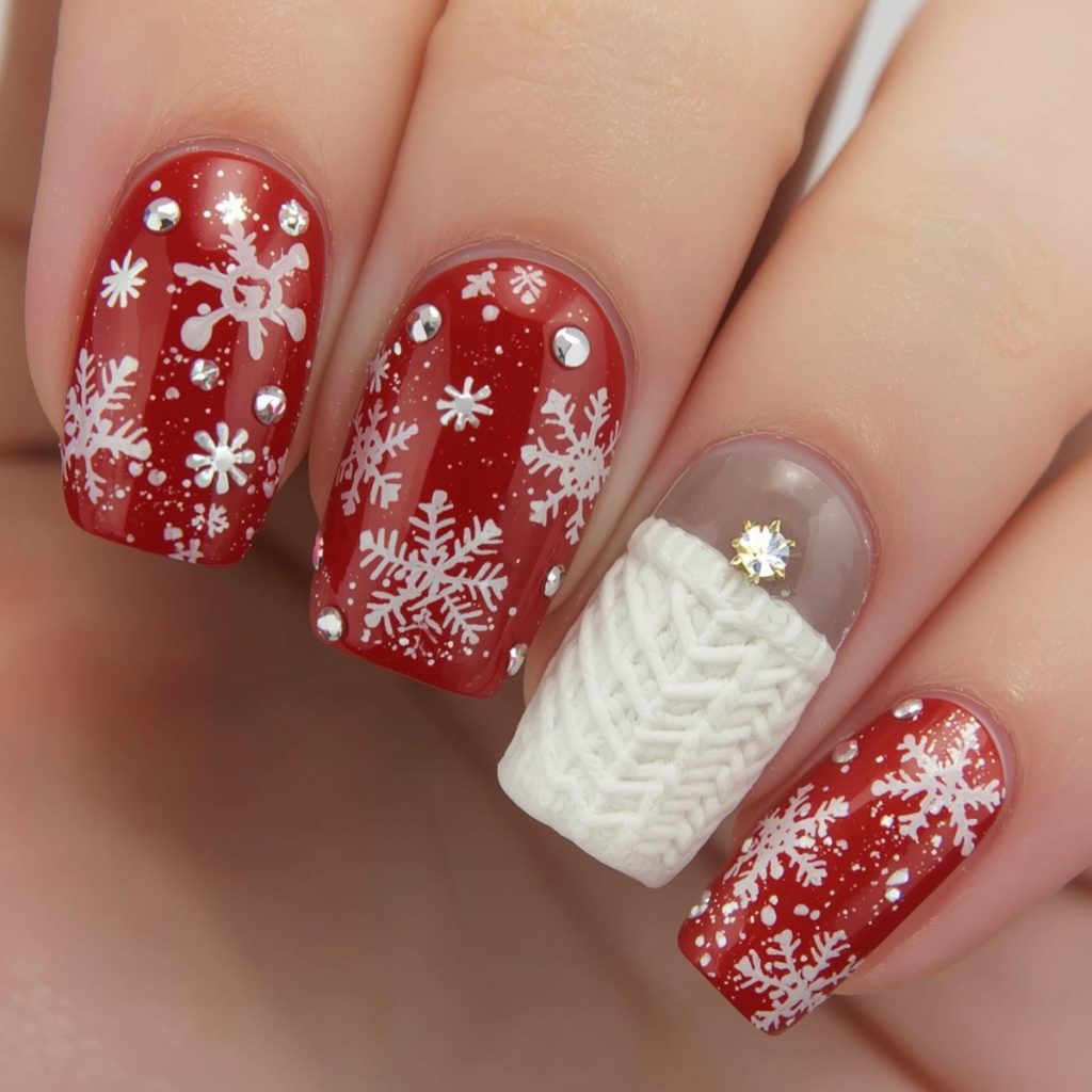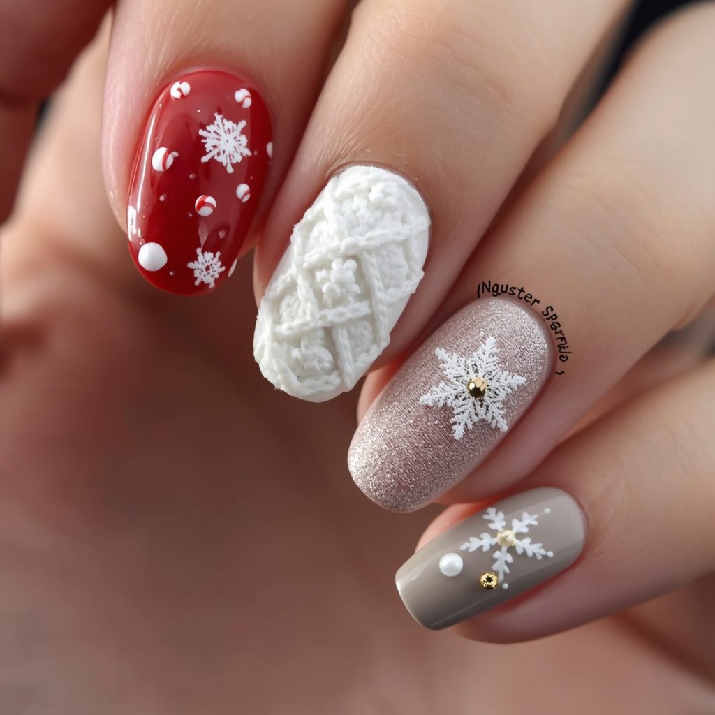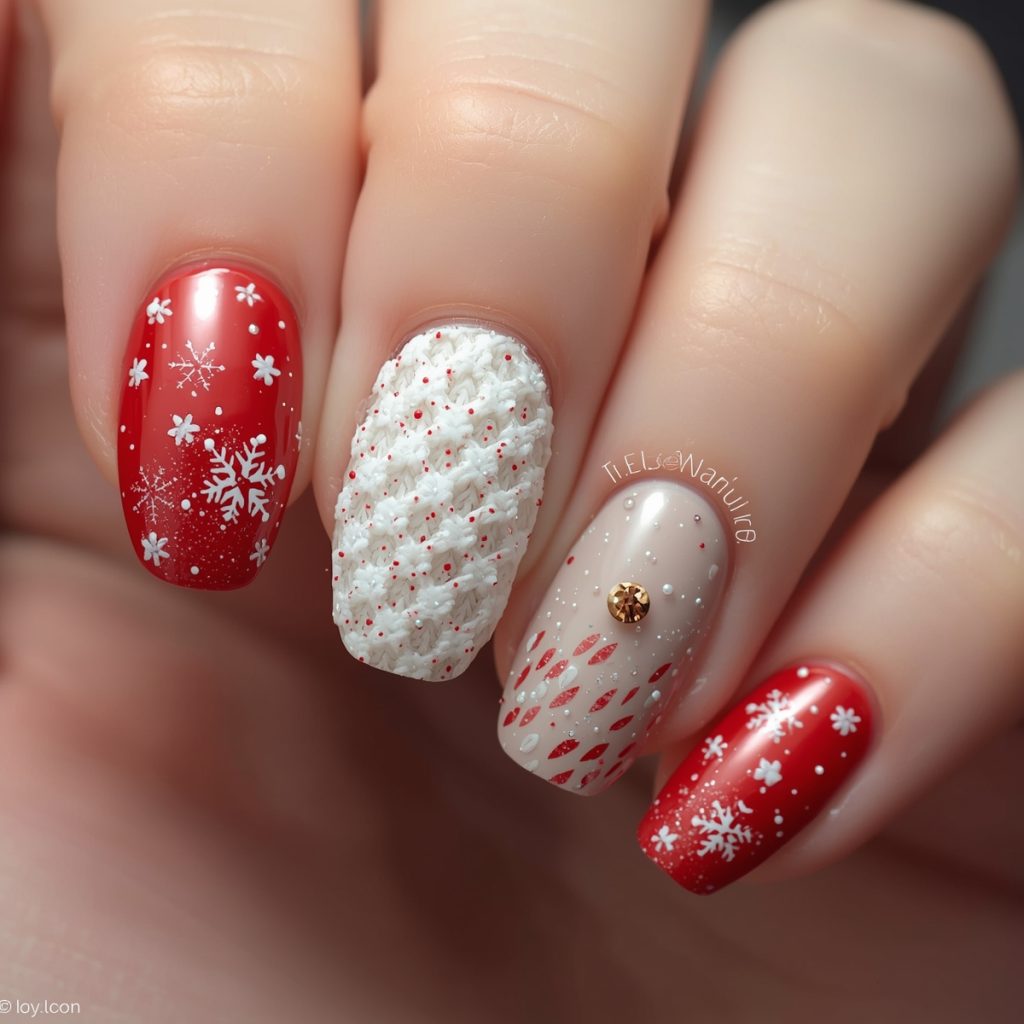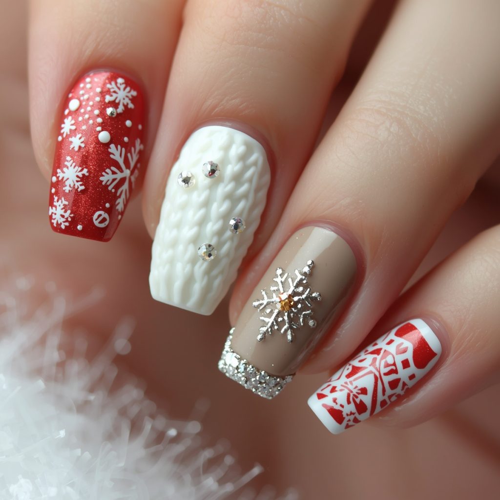 This stunning Christmas-inspired manicure perfectly captures the magic of winter with a playful mix of festive textures and classic holiday motifs. The set against a rich red and neutral palette. The glossy candy-apple red base acts as a bold foundation, adorned with delicate white snowflakes, shimmering star accents, and peppermint candy stripes that evoke the joy of the season.