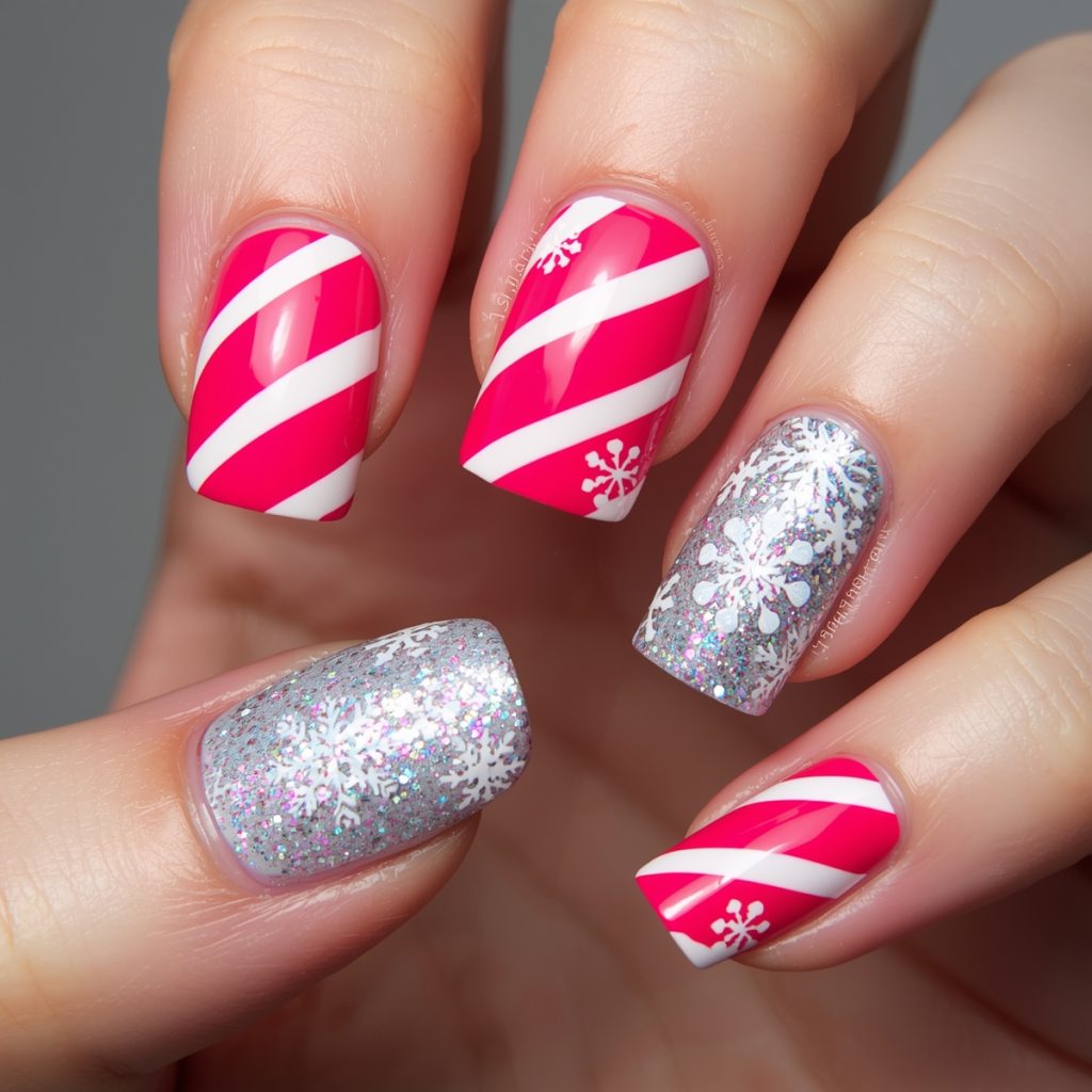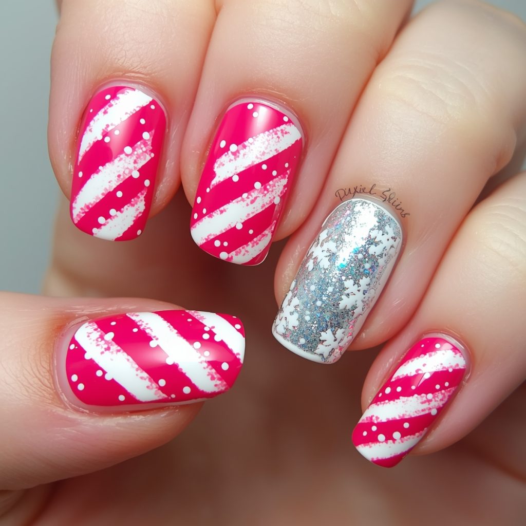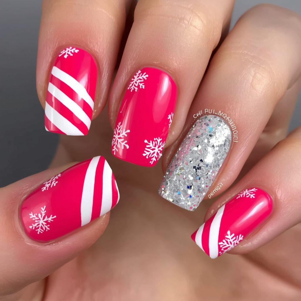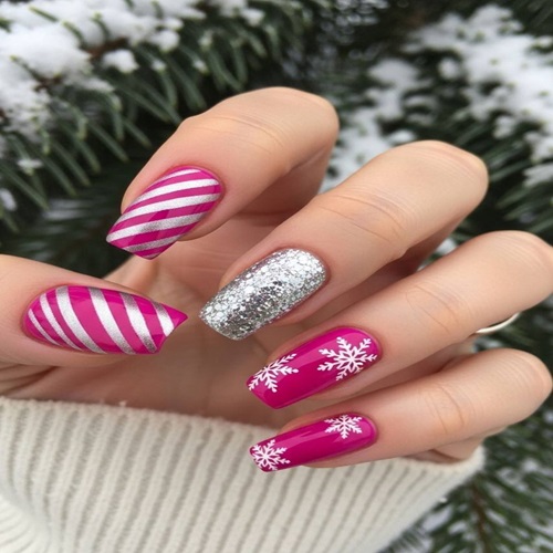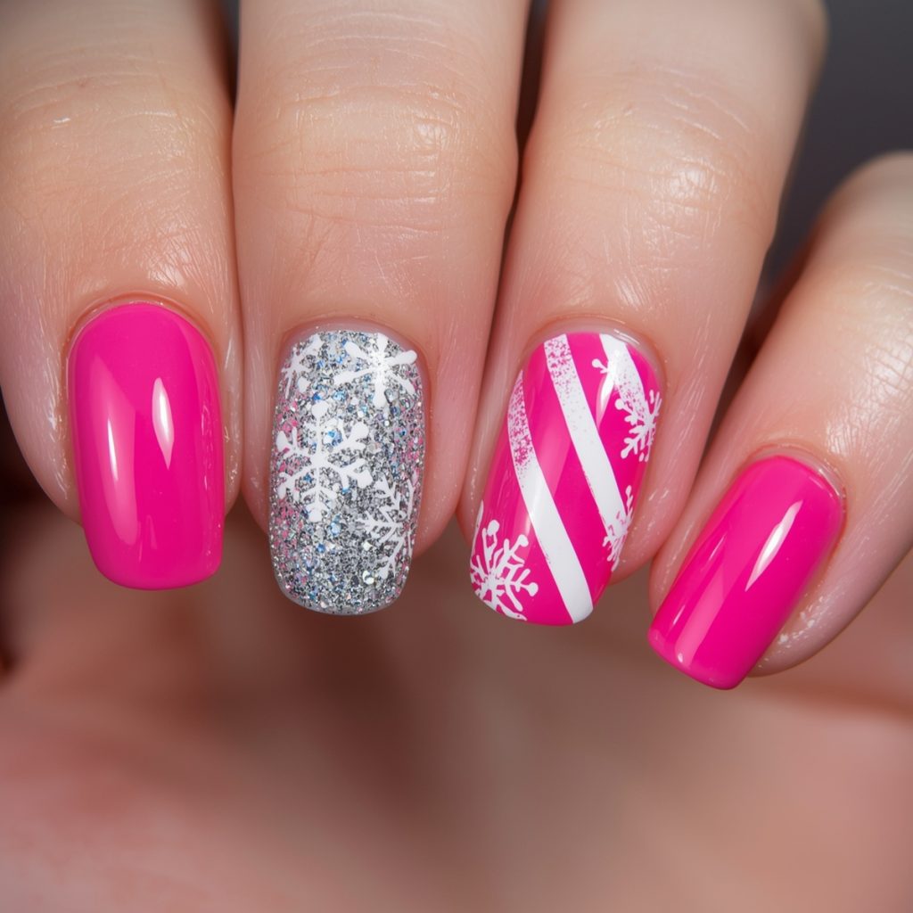 This vibrant, modern twist on holiday nails screams festive fun with a bold hot-pink base that feels fresh and playful against traditional Christmas reds. Glossy magenta nails are decorated with crisp white diagonal candy-cane stripes and delicate hand-painted snowflakes, instantly evoking peppermint candies and snowy nights.