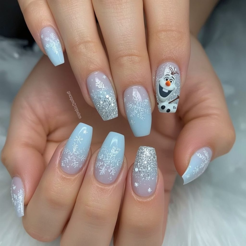 A playful Frozen-inspired winter dream in soft icy blues and dove greys. Long coffin nails feature a delicate ombre fade dusted with shimmering snowflakes that look hand-painted by Elsa herself. The undeniable star is the adorably detailed Olaf on the ring finger – complete with carrot nose, coal smile, and twig hair – bringing instant joy and nostalgia.