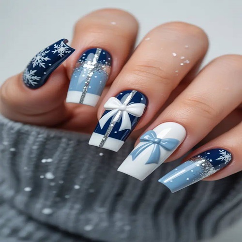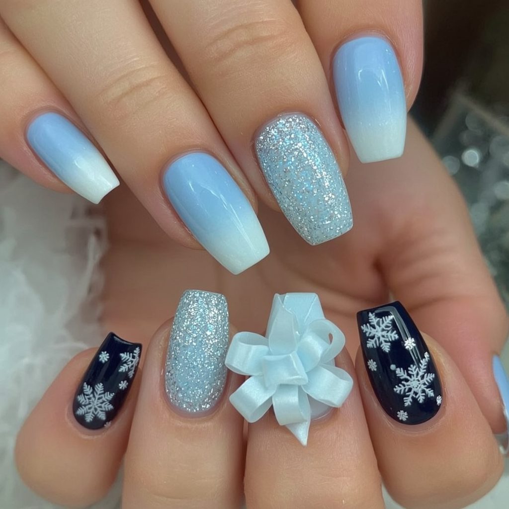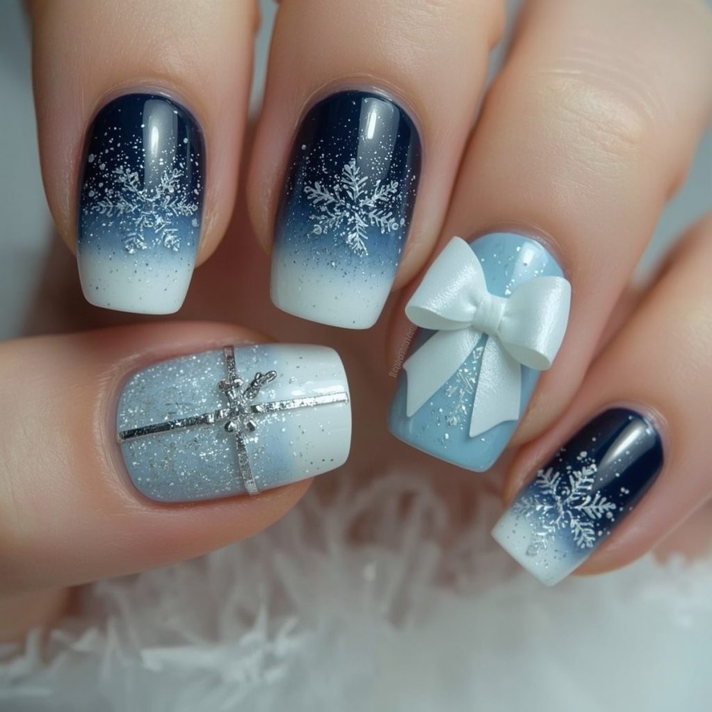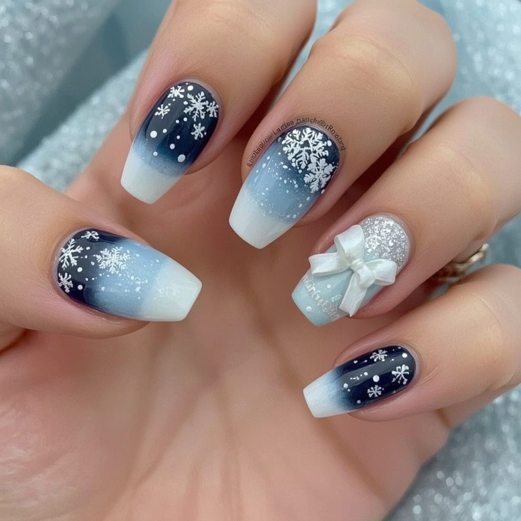 This enchanting icy-blue Christmas manicure feels like opening beautifully wrapped gifts on a snowy morning. Soft ombre gradients shift from crisp white French tips to shimmering midnight and powder-blue bases, dusted with delicate silver glitter that mimics falling snow. The stars of the set are the meticulously sculpted 3D bows — one pristine white, one pale frosted blue — perched like perfect satin ribbons on gift-box nails outlined with thin silver stripes.