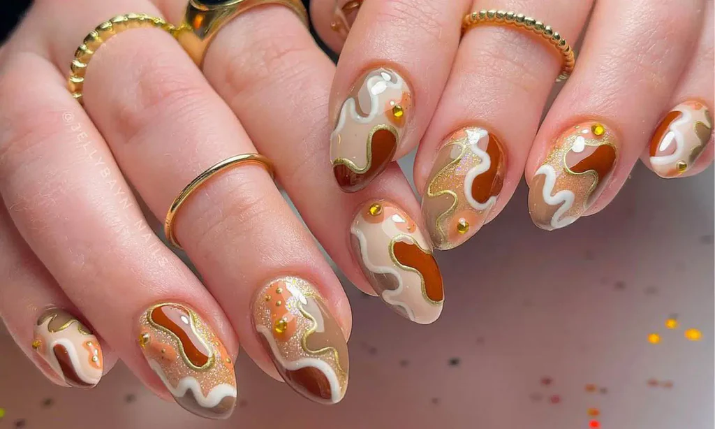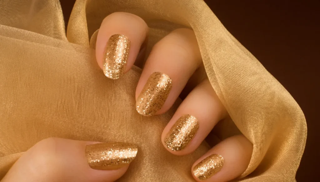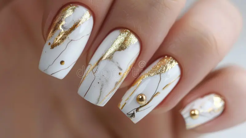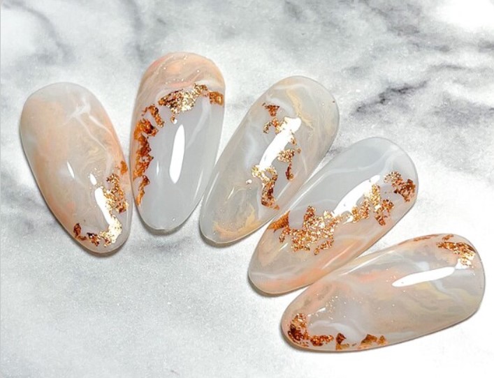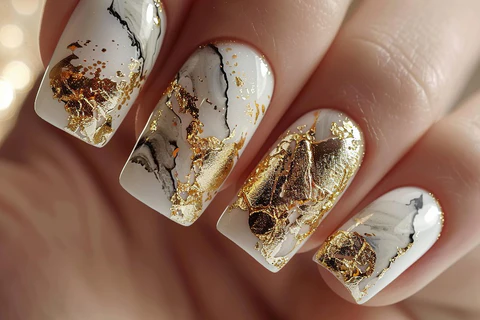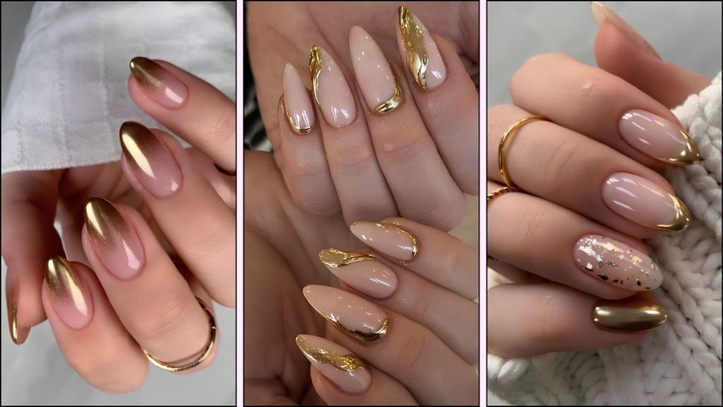 1. Scattered Foil Flecks on Nude Base Minimal yet opulent: Apply irregular gold foil flakes randomly over a sheer nude or milky polish for a “floating gold” effect. Ideal for subtle holiday glow.