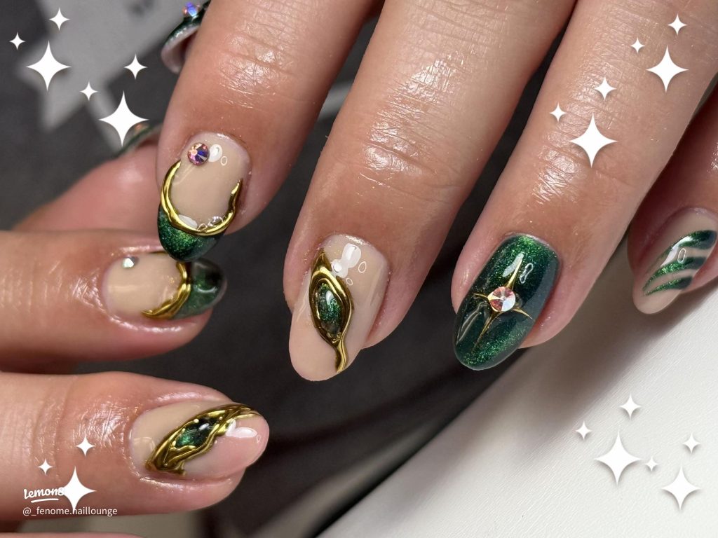 5. Abstract Lines or Cuticles Dab foil along cuticles or in thin abstract lines over matte bases. Matte emerald with gold cuticle foil echoes your “Emerald Elegance” vibe.