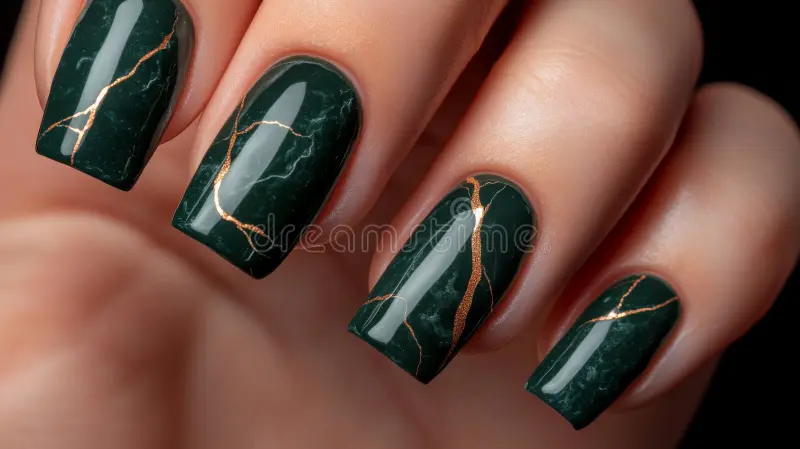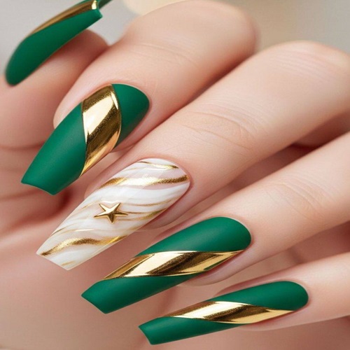 3. Gold Foil Marble Accents Swirl gold foil into white or emerald marble on accent nails. This malachite-inspired look feels rich and gem-like, tying into winter jewel tones.