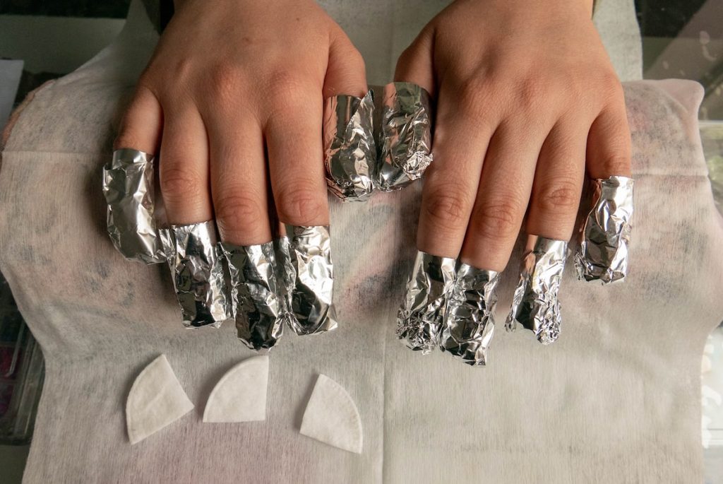 Soak cotton in acetone, place on nail, wrap tightly with foil.