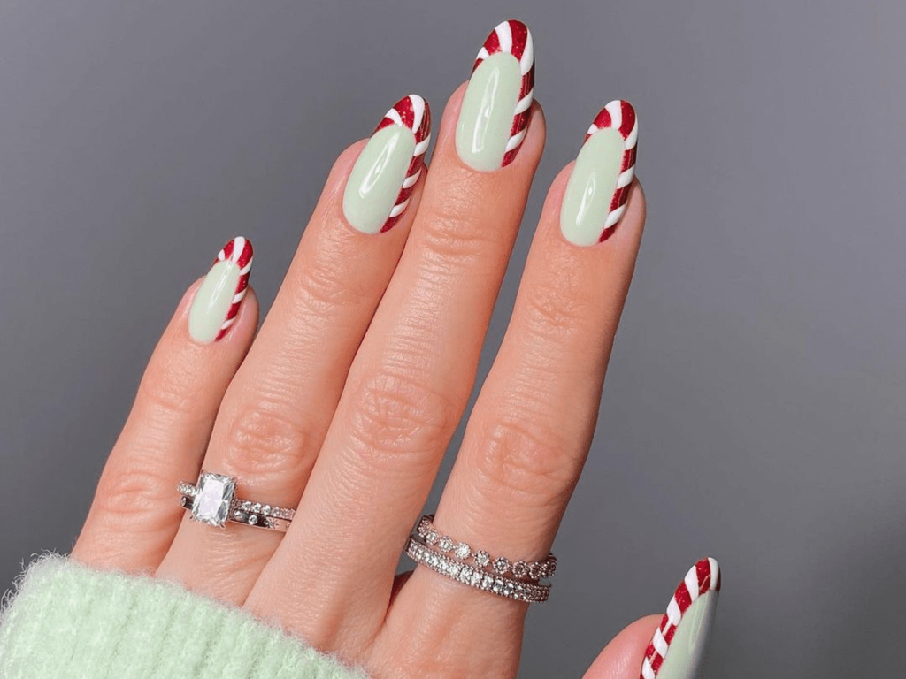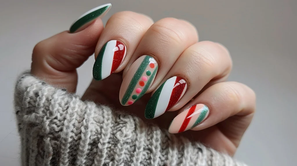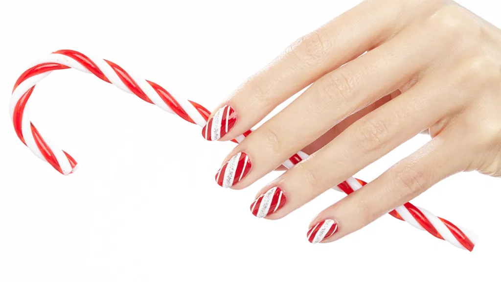 Clean diagonal or vertical red-and-white stripes mimicking traditional candy canes, often with a glossy top coat for extra pop.