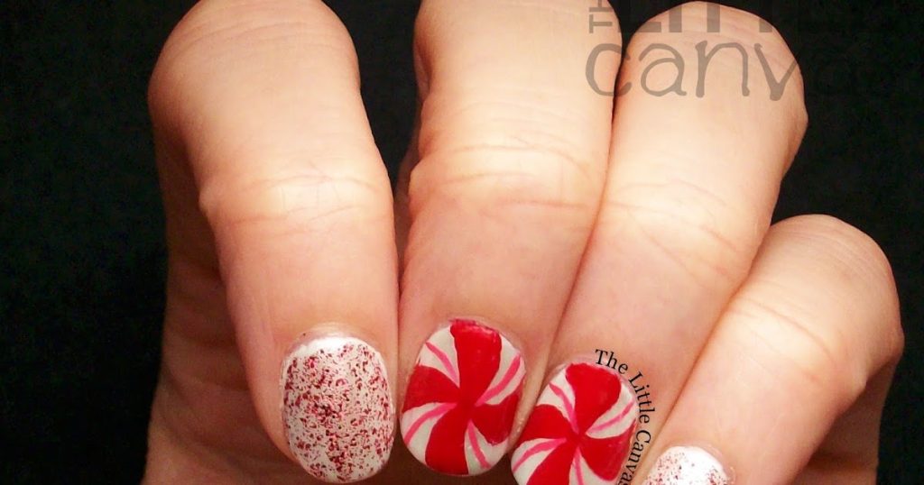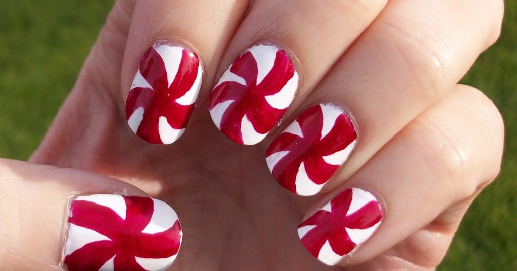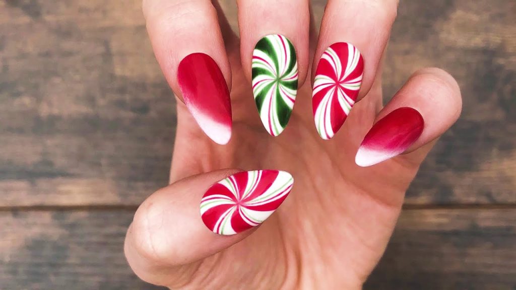 Peppermint Swirls Use thin brush: Start from center, draw curved red lines outward like spokes (at 12, 2, 4, 6, 8, 10 o’clock). Fill alternating sections with red. Add thinner green curves between for peppermint effect. Use toothpick to drag/swirl slightly for candy look. Cure.