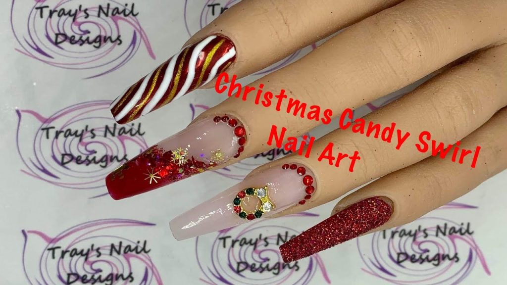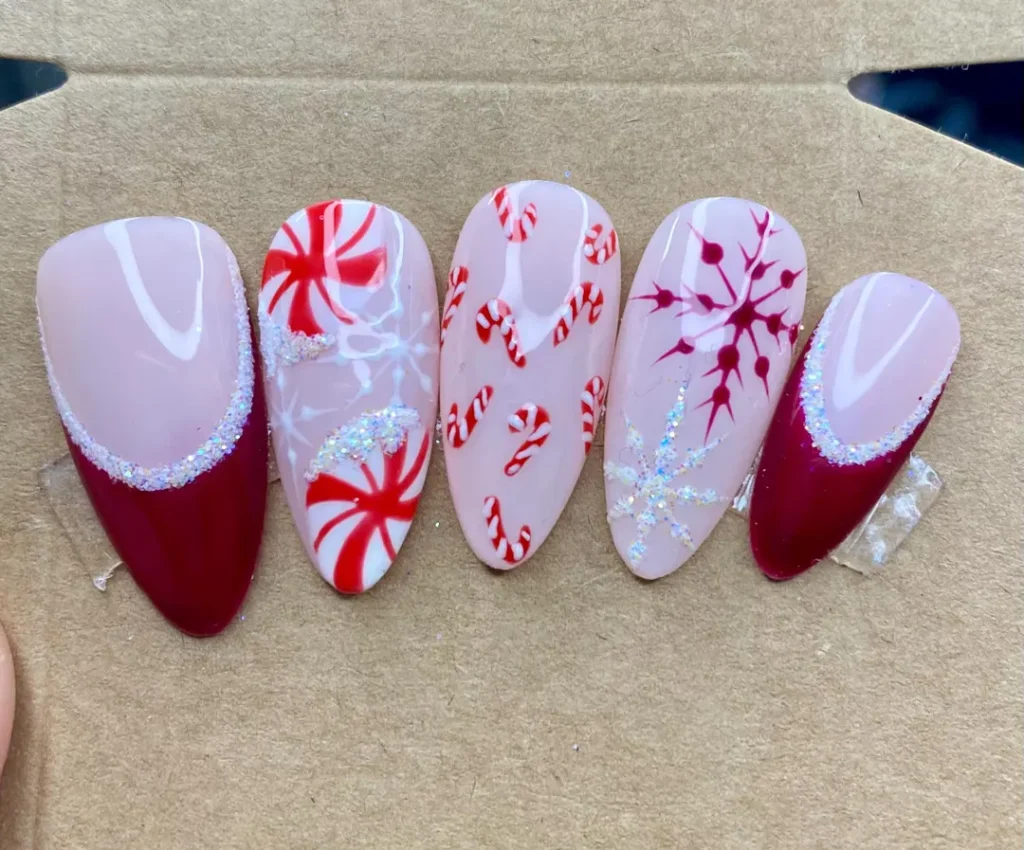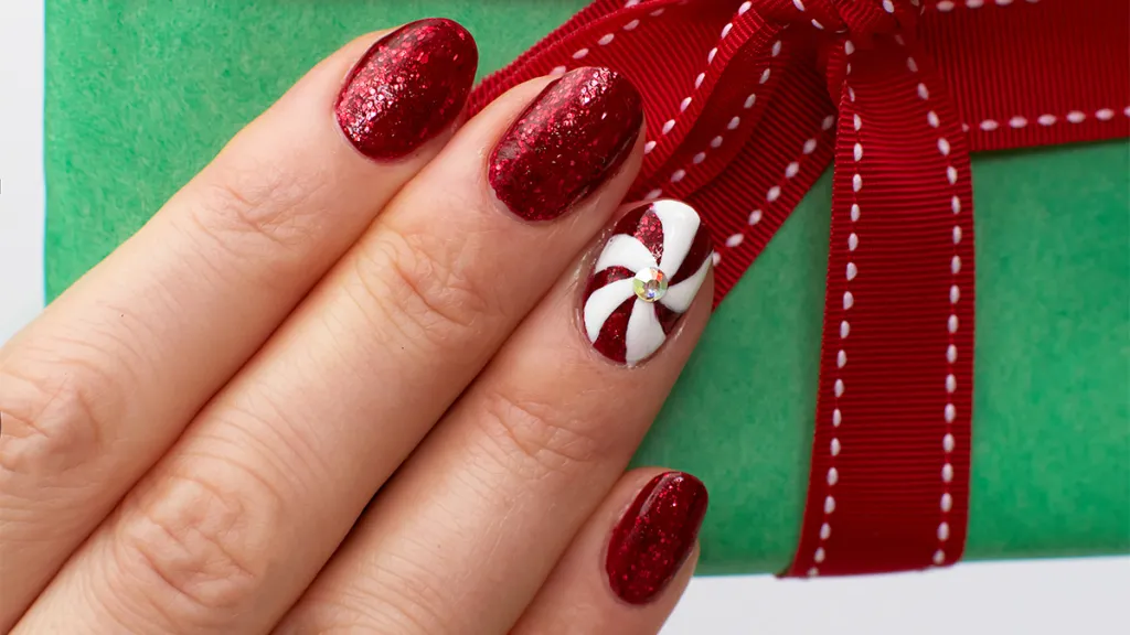 Glossy red chrome accents paired with swirling peppermint patterns in red, green, and white for a shiny, candy-like effect.
