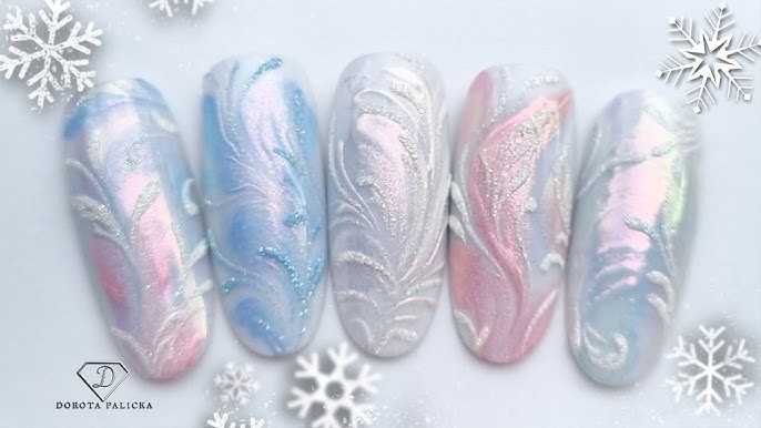 This enchanting winter manicure features a mesmerizing iridescent chrome base shifting between soft purple, blue, and pink hues, reminiscent of the Northern Lights dancing across a snowy sky.