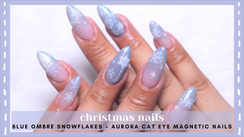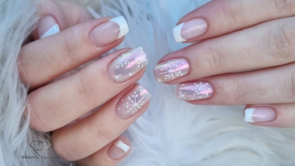 Delicate white snowflake designs adorn several accent nails, adding intricate frosty elegance. Paired with a flocked Christmas tree backdrop and cozy knit sleeve, it captures pure holiday magic—ethereal, shimmering, and perfect for festive celebrations.