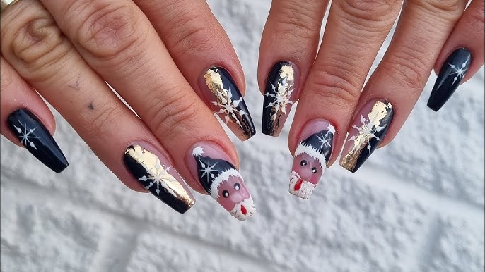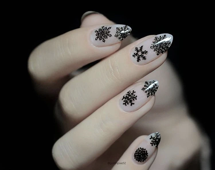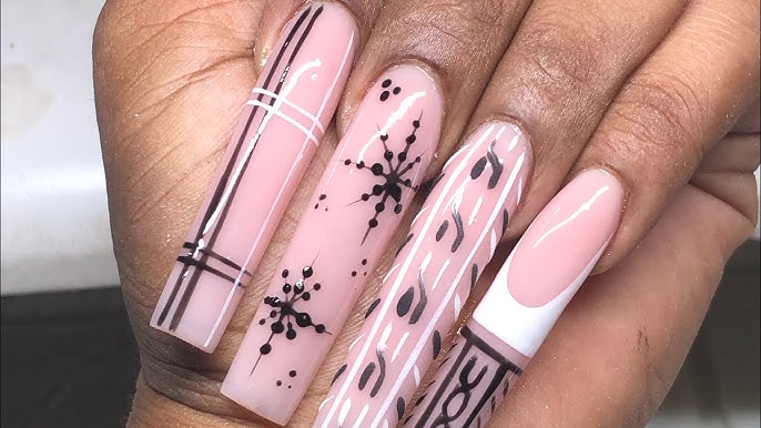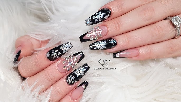 Bold black and white coffin nails featuring intricate snowflake accents, diagonal stripes, sharp V-tips, and sparkling black glitter for dramatic winter elegance.