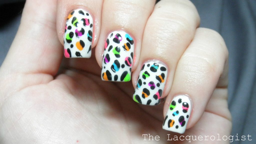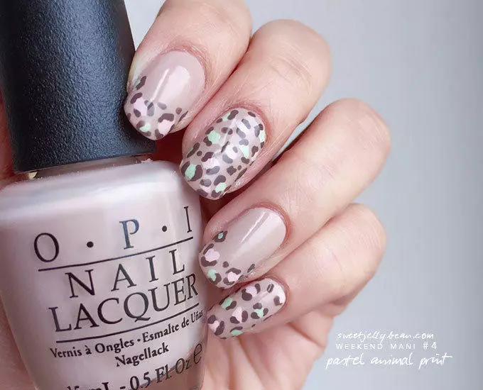 Add black spots With black polish and a small dotting tool or brush, make irregular ovals and blobs scattered across the nail (like leopard spots). Leave space between them. Dry.