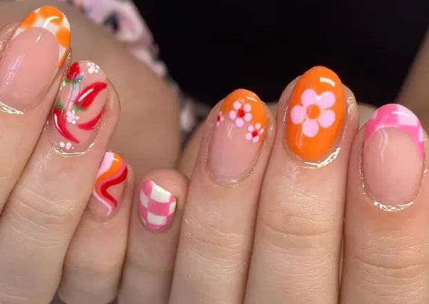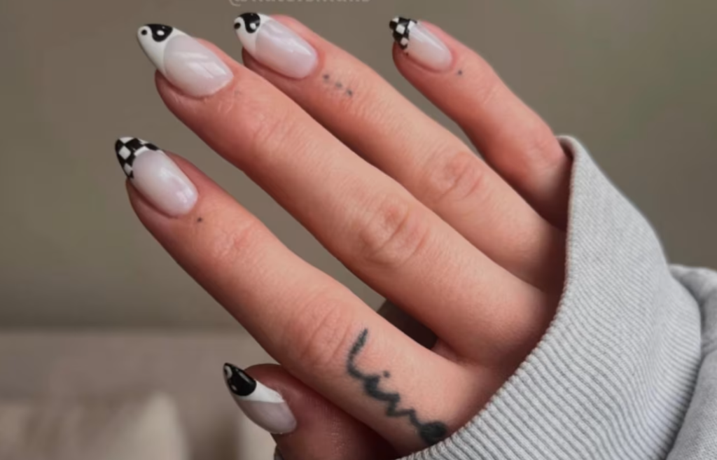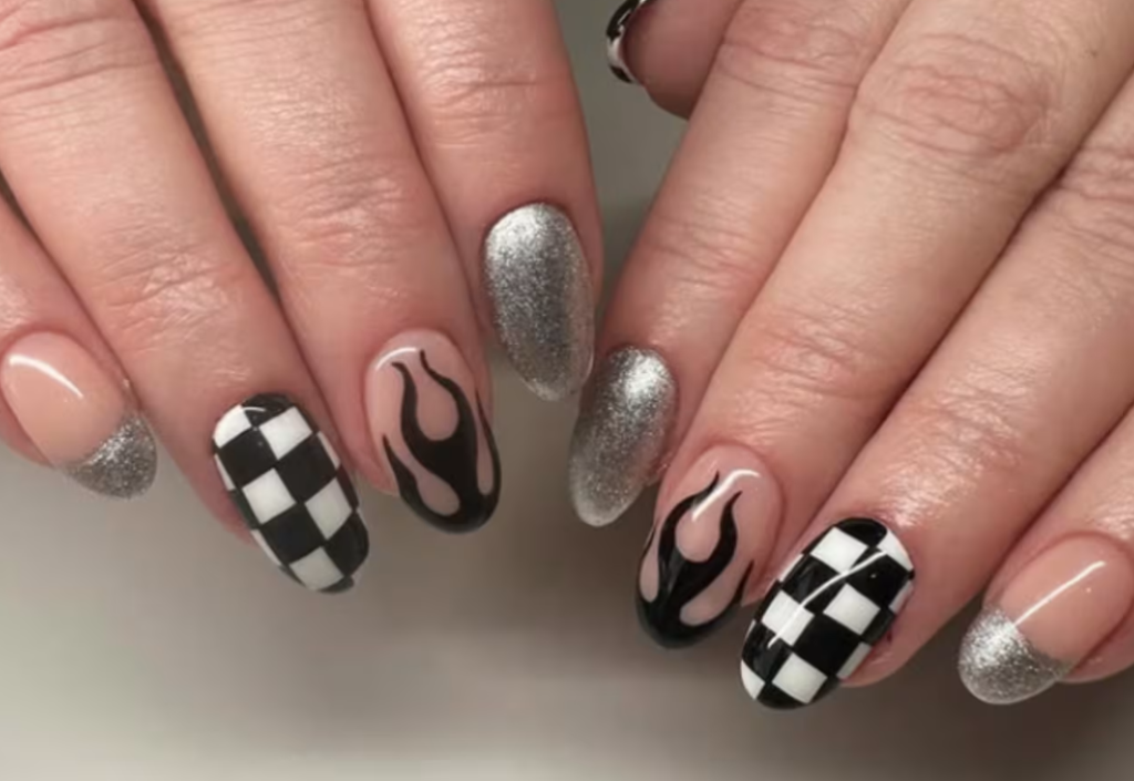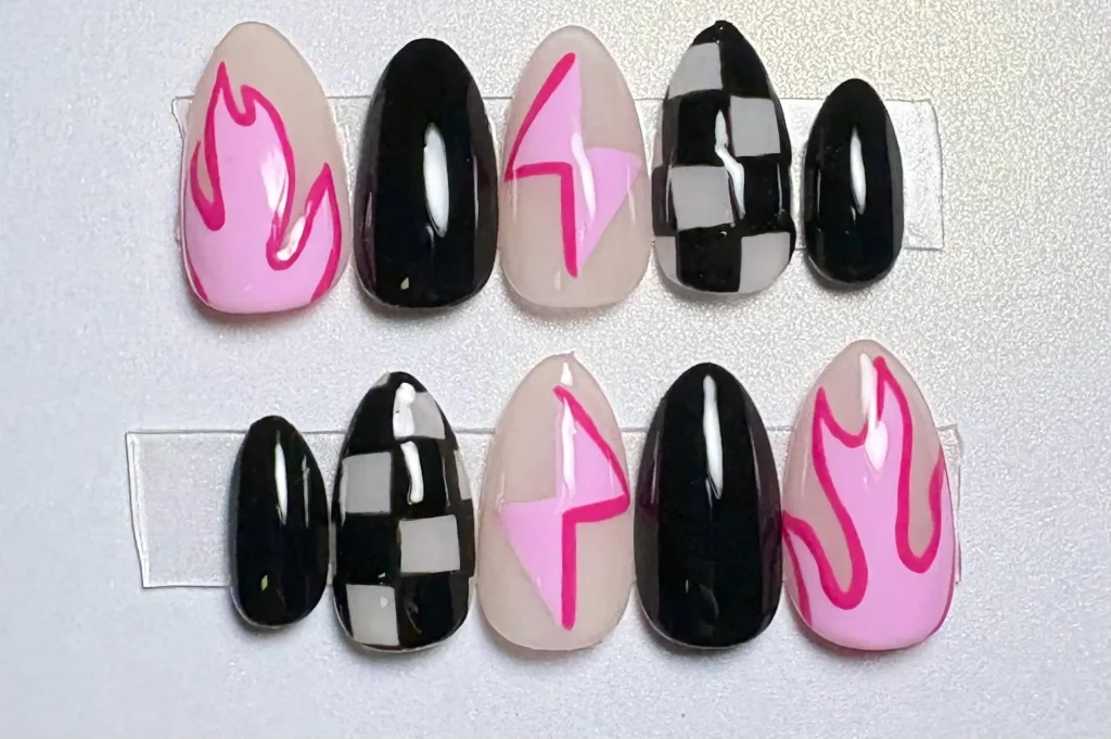 This edgy manicure blends classic yin-yang symbols for balance, bold black-and-white checkerboard patterns evoking racing flags, fiery flame accents, and split French tips on a soft pink base.