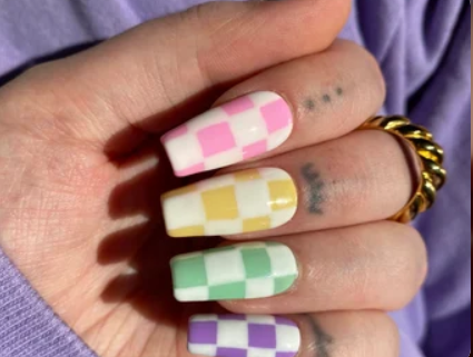 Retro Pastel Press-Ons Y2K-inspired pastel checks in pink, purple, and yellow.