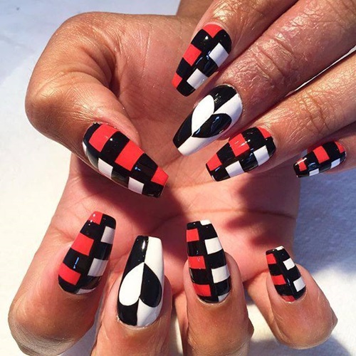 Bold red, black, and white checkerboard patterns race across nails, accented by playful split-heart designs for a high-energy, edgy vibe with romantic flair.