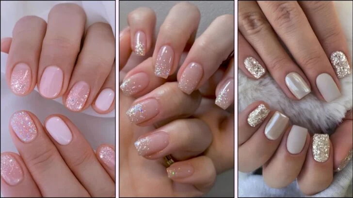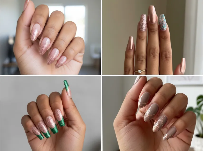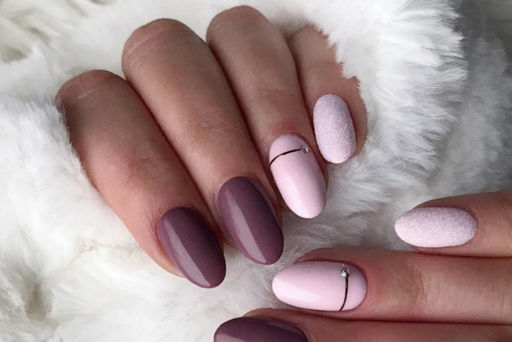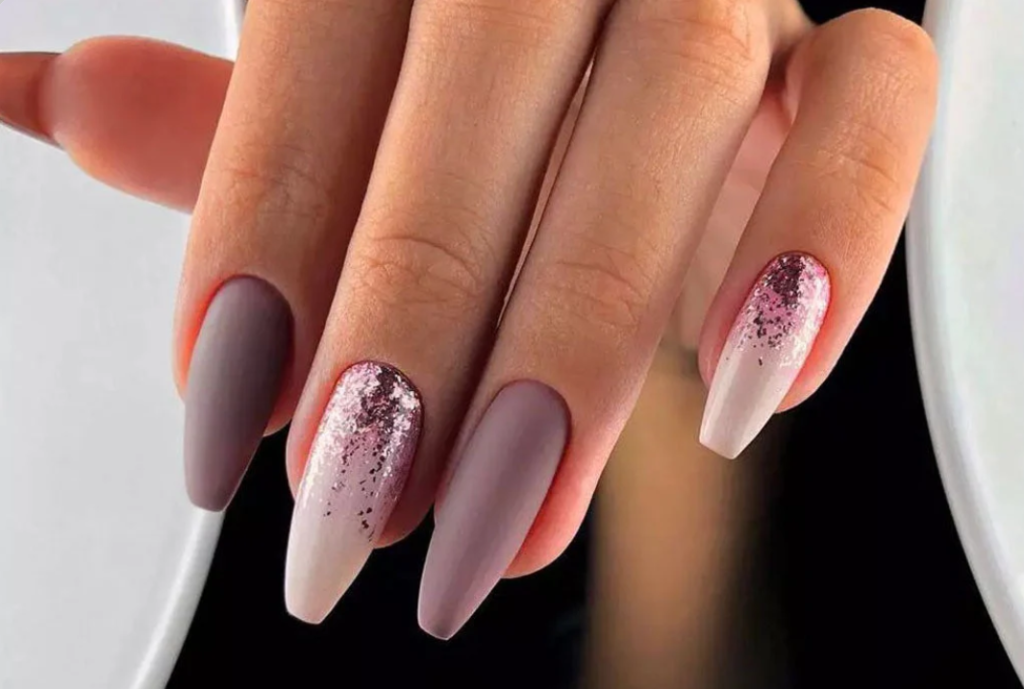Mauve with Glitter Accents Matte or glossy mauve base topped with rose-gold or silver glitter tips for sparkle without overwhelming.