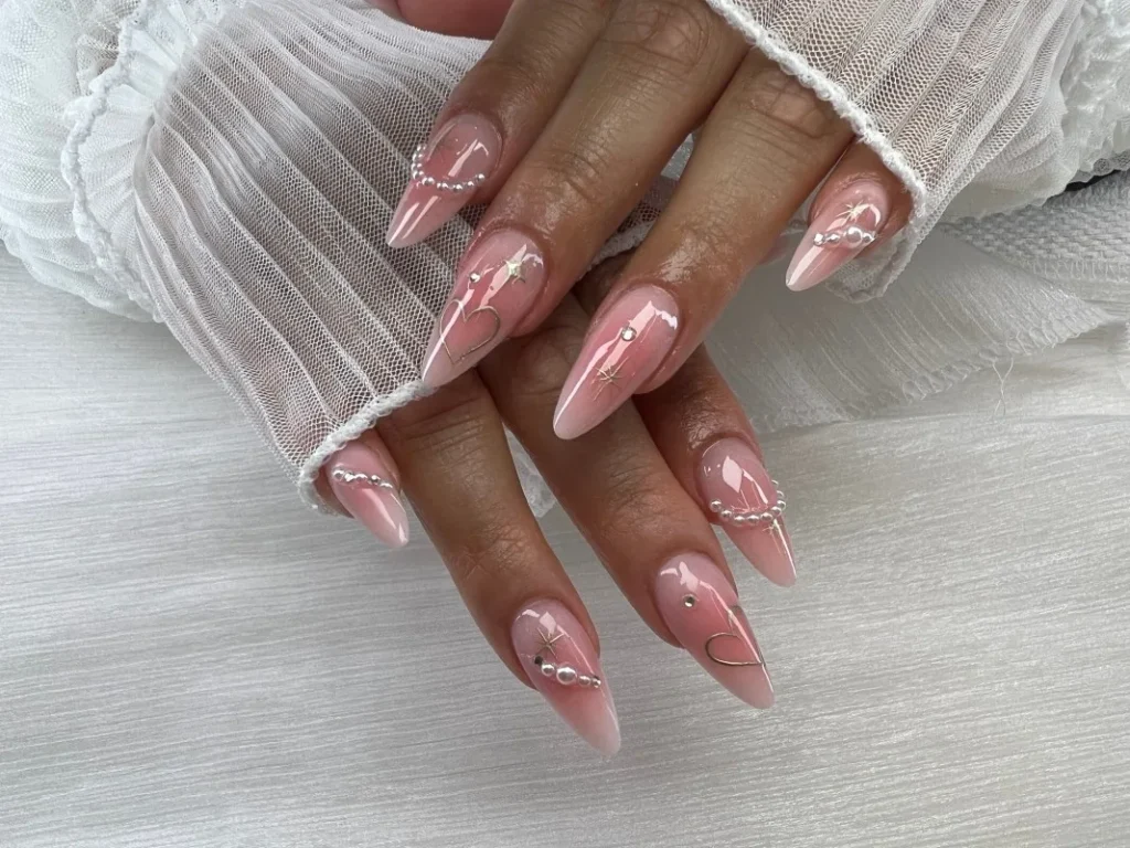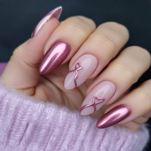 Stunning almond nails blend soft mauve pink bases with chrome rose accents, delicate pink ribbon and heart details, creating a romantic, elegant, and subtly meaningful look. 💕