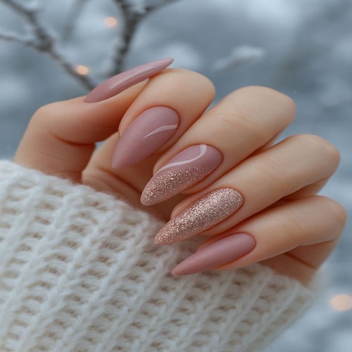 Soft nude-mauve almond nails with delicate white crescent moons on glossy bases, accented by shimmering rose-gold glitter tips for a cozy, ethereal winter elegance. ❄️