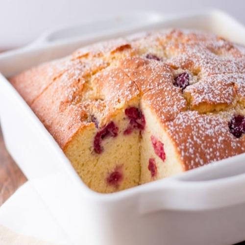 Pour the batter into a 9″ by 9″ pan, and top off with the remaining raspberries.