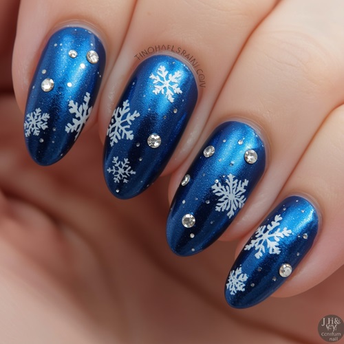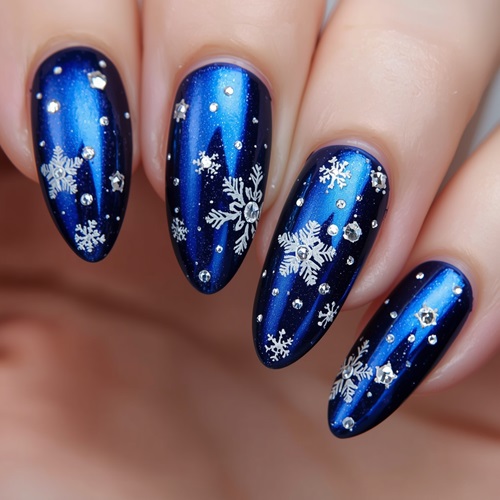 These stunning Midnight Blizzard Chrome Nails capture the essence of a winter wonderland with their deep sapphire-blue chrome base that mirrors the reflective sheen of freshly fallen snow under moonlight. The high-shine metallic finish creates a liquid-metal effect, making each almond-shaped nail a miniature work of art. Delicate white snowflake decals, hand-painted with precision, dance across the surface in varying sizes, some accented with tiny silver rhinestones that catch light like frost crystals. The negative-space detailing adds depth, while micro-glitter flecks evoke falling snow.