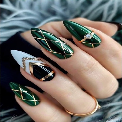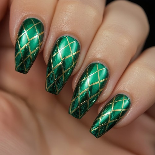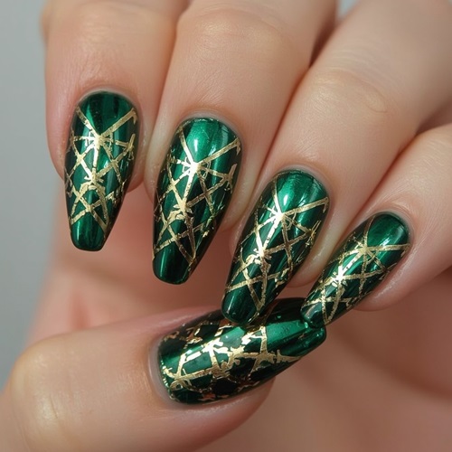 Emerald Lattice Luxe a nail masterpiece that fuses opulent jewel tones with architectural precision. The deep emerald-green chrome base gleams like polished malachite, its mirror finish reflecting light in hypnotic waves across sharply stiletto-shaped tips. Delicate gold foil lines intersect in a flawless lattice pattern, creating a geometric cage that traps luxury within each nail.