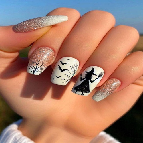 Step into a moonlit spell with “Enchanted Witching Hour,” a hauntingly elegant nail design that blends minimalist artistry with Halloween mystique. Soft nude-to-white ombré bases fade like mist at dawn, dusted with ultra-fine champagne glitter that catches light like stardust on frost. Coffin-shaped nails serve as tiny canvases for midnight tales: one features a stark black silhouette of a witch mid-flight, her broom trailing stardust; another hosts barren, twisted tree branches reaching toward a flock of bats etched in glossy ebony.