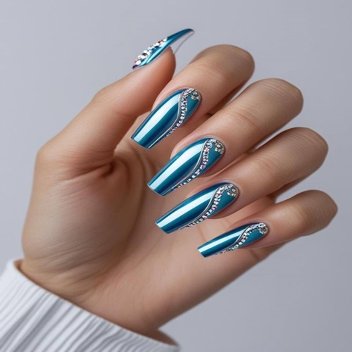 Dive into luxury with “Ocean Chrome Swirls,” a mesmerizing nail design that captures the fluid elegance of deep-sea waves in a high-shine chrome finish. The striking turquoise-blue base reflects light like liquid metal, creating a futuristic, mirror-like effect that shifts with every movement. Each elongated coffin-shaped nail features hand-painted swirling silver chrome lines that mimic the graceful flow of ocean currents, accented by precisely placed clusters of micro-crystals and iridescent rhinestones.